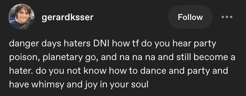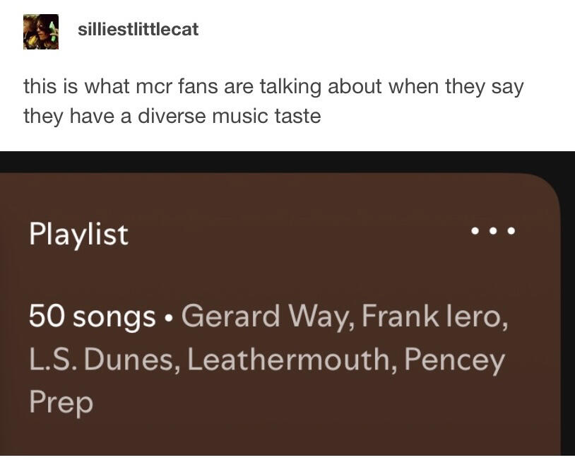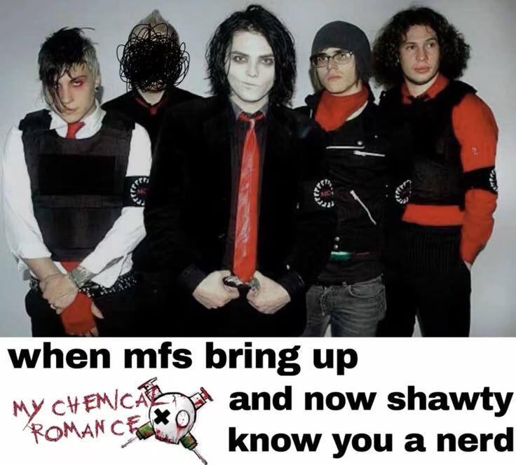 afi ★ aiden ★ alkaline trio ★ the all-american rejects ★ the amity affliction ★ armor for sleep ★ as it is ★ blink-182 ★ bring me the horizon ★ don broco ★ fall out boy (pre-hiatus, my beloved) ★ frank iero and the cellabration / patience / future violents ★ from first to last ★ good charlotte ★ hawthorne heights ★ leathermøuth ★ marianas trench ★ mindless self indulgence (NOT jimmy urine) ★ minor threat ★ motion city soundtrack ★ my chemical romance ★ mxpx ★ nirvana ★ the offspring ★ owl city ★ paramore ★ pencey prep ★ point north ★ the ready set ★ remo drive ★ robbietheused ★ say anything ★ senses fail ★ silverstein ★ simple plan ★ something corporate ★ sonny moore ★ sum 41 ★ taking back sunday ★ underøath ★ the used ★ wallows ★ waterparks ★ with confidence ★ yellowcard ★ yungblud ★ + endless others !! <3